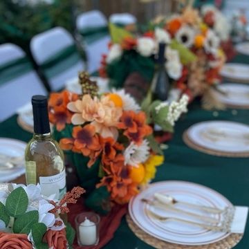 Package includes: Tablescape, Chair Covers, Centerpieces, and 1 Organic Balloon Arch